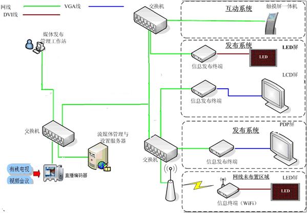 管理人員在信息中心就可以將制作好的宣傳信息隨時傳遞到分布在任意地點的顯示終端(顯示器、電視機),并隨時能控制任意終端播放的內(nèi)容和播放形式。